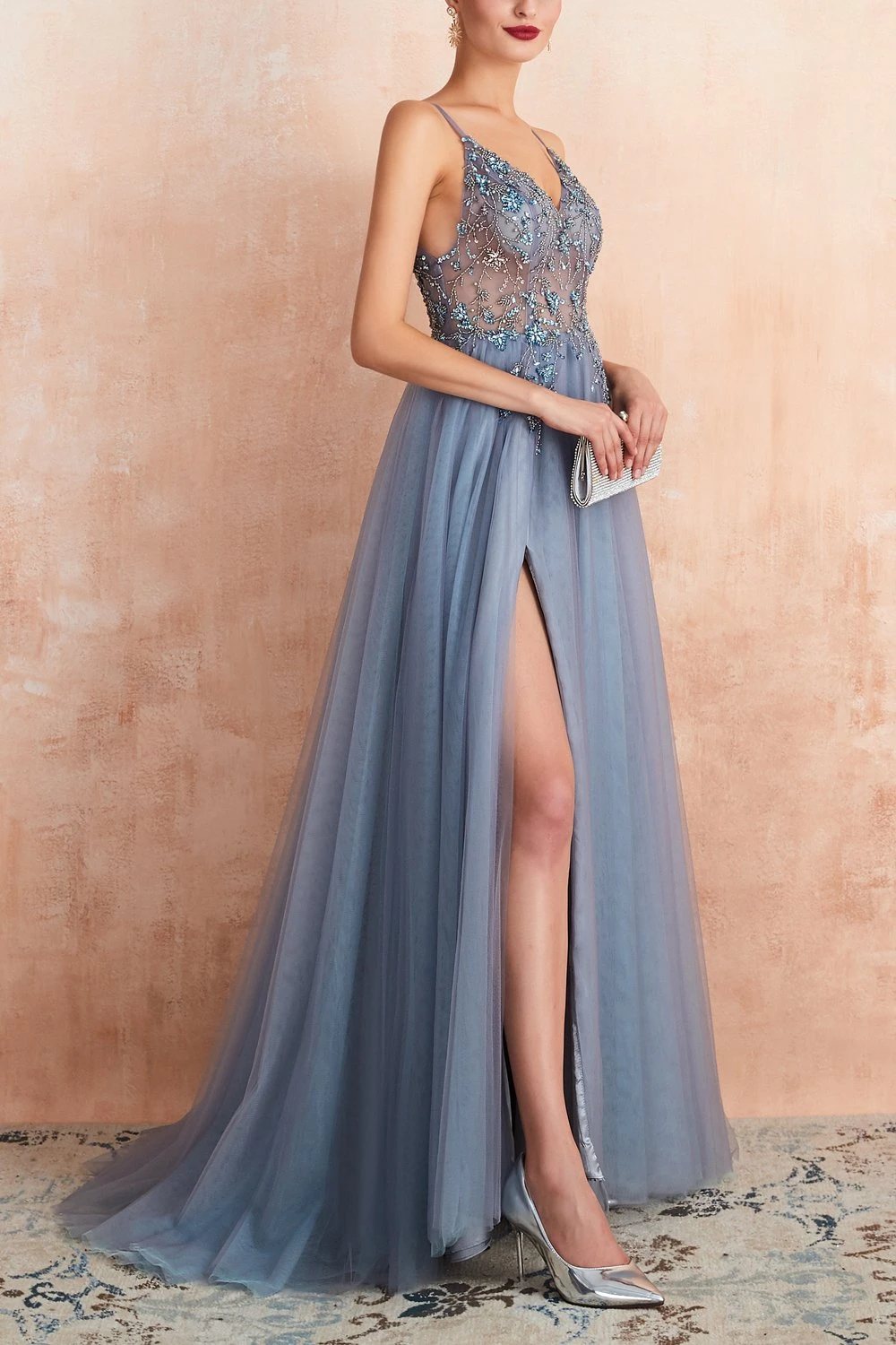 V-neck Slit Tulle Dress